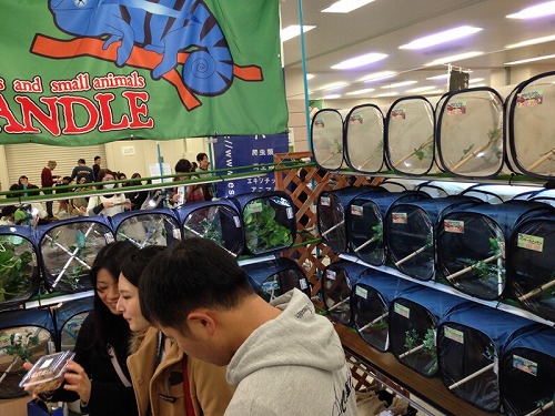 いつもはパック生体を多めに並べるのですが、今回はカメレオン屋の真骨頂、『これぞカメレオン屋!!』という品揃えで、ブースの半分以上を、45個以上のカメレオンケージが並ぶと言う展開をさせていただきました。